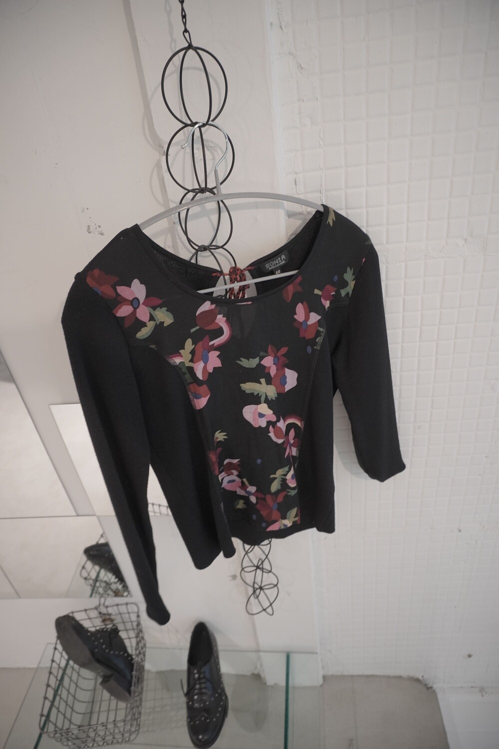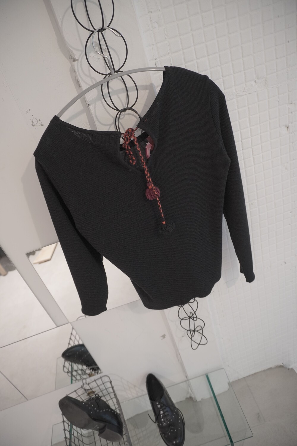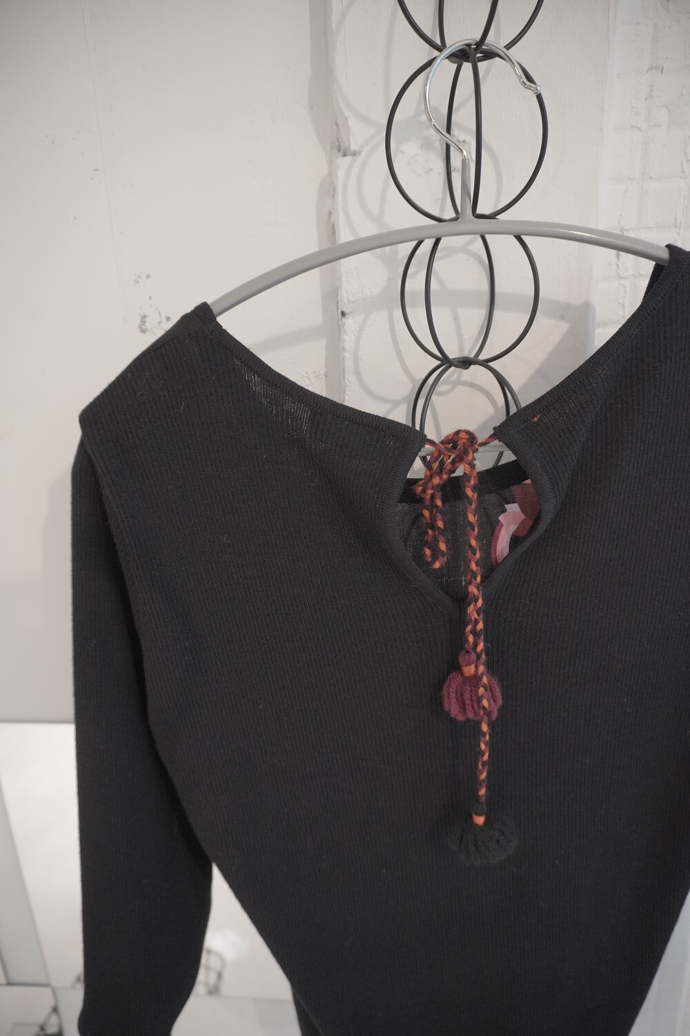 소니아 리켈(Sonia Rykiel)의 롱슬리브 탑입니다. 부드럽고 신축성 있는 블랙 리브 조직 바디에 브랜드의 시그니처인 멀티 컬러 스트라이프 배색이 넥라인과 암홀을 따라 정교하게 들어가 있습니다. 단독으로 착용했을 때 어깨 라인이 예쁘게 드러나며, 자켓이나 가디건 속 이너로 활용하여 스트라이프 포인트를 보여주기에도 좋은 아이템입니다.