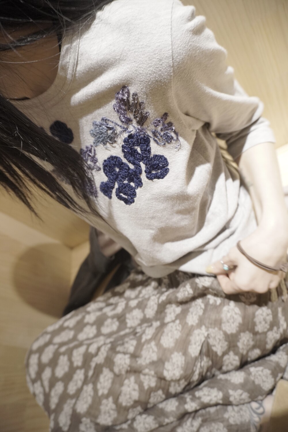 라이트 멜란지 그레이 컬러를 베이스로, 전면 상단에 배치된 블랙과 화이트 톤의 입체적인 꽃 자수 디테일이 돋보이는 제품입니다. 일반적인 프린팅이 아닌 자수와 패치워크 형태의 디테일로 제작되어 트리콧 라인 특유의 핸드메이드적 가치와 아방가르드한 무드를 동시에 느낄 수 있습니다. 적당한 두께감과 부드러운 터치감으로 단독 착용은 물론, 셔츠와 레이어드했을 때 멋스러운 아이템입니다.