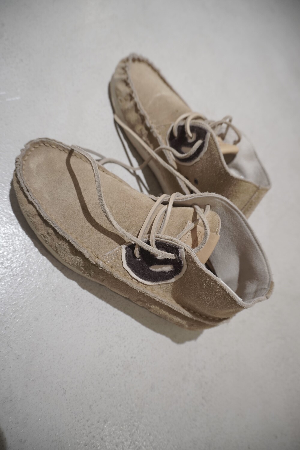 베이프(BAPE)의 컴포트 스웨이드 모카신입니다. 클락스(Clarks)의 왈라비 실루엣, 전면 어퍼에 배치된 다크 브라운 APE HEAD 자수가 돋보이는 제품입니다.