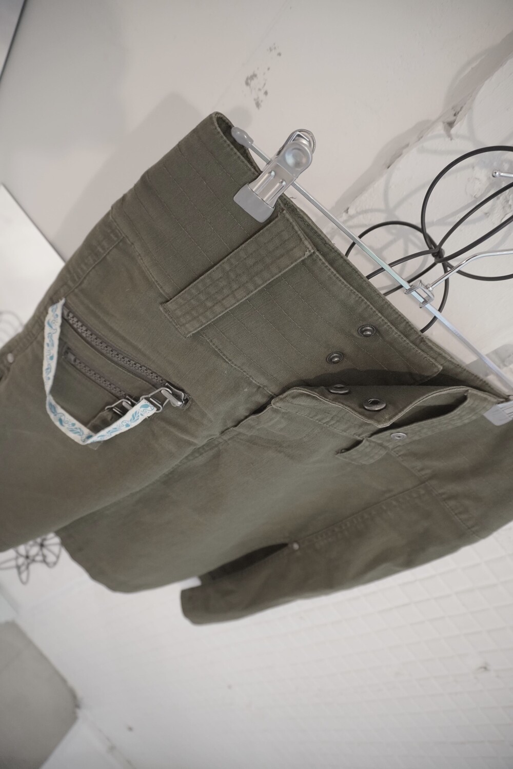 특히 허리 라인이 높게 잡힌 하이웨이스트 실루엣에 독특한 카고 스타일의 사선 지퍼 디테일과 화이트/블루 배색의 루프 스트랩이 포인트가 되어 심플한 상의와 매치해도 확실한 존재감을 드러내는 제품입니다.