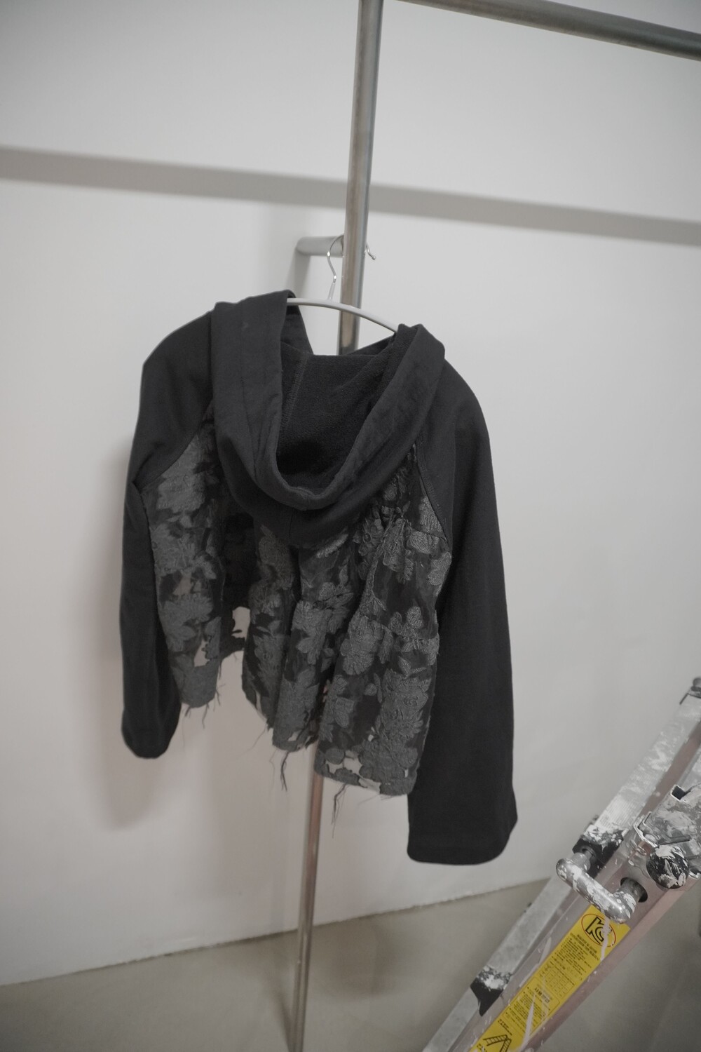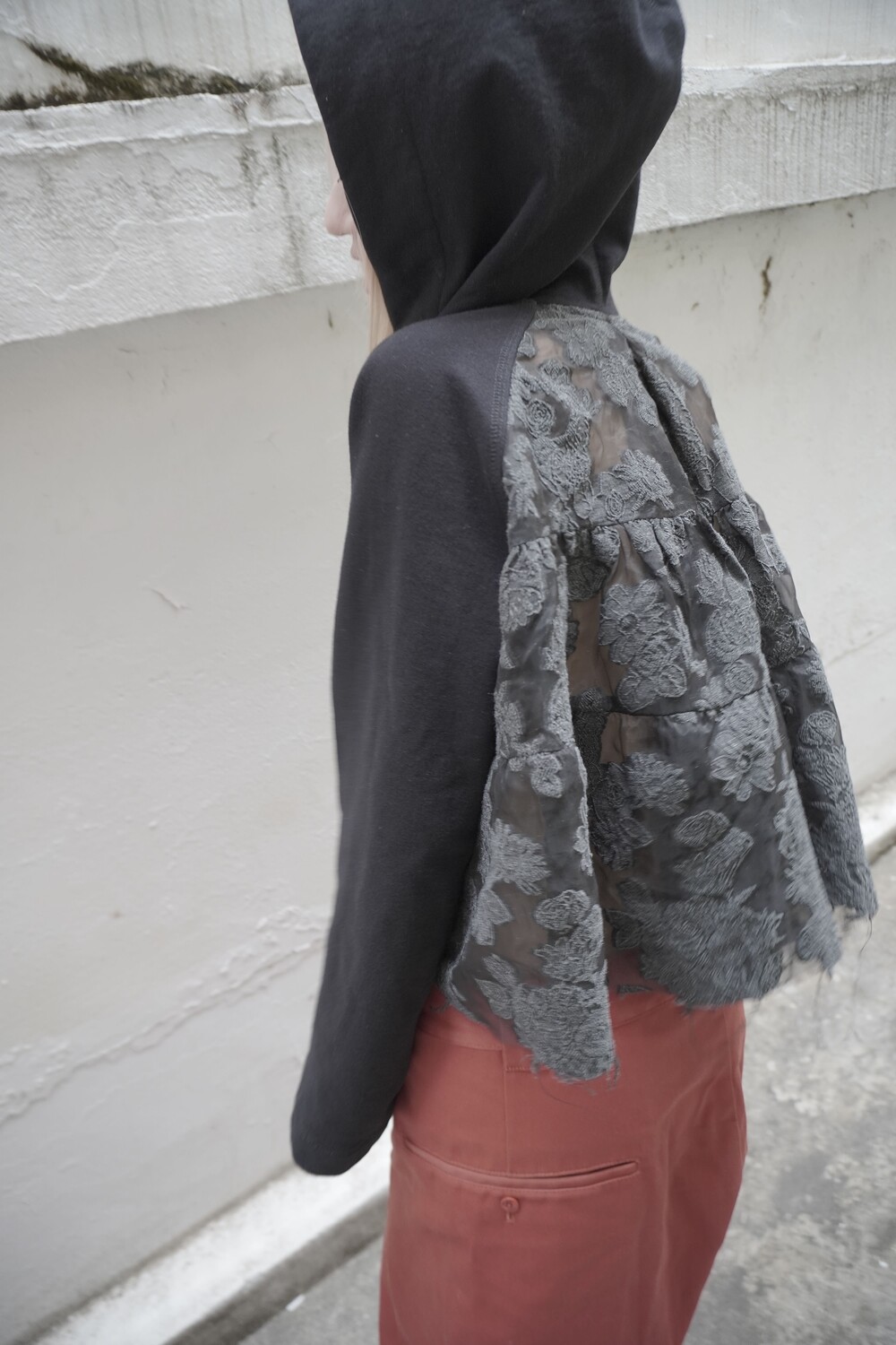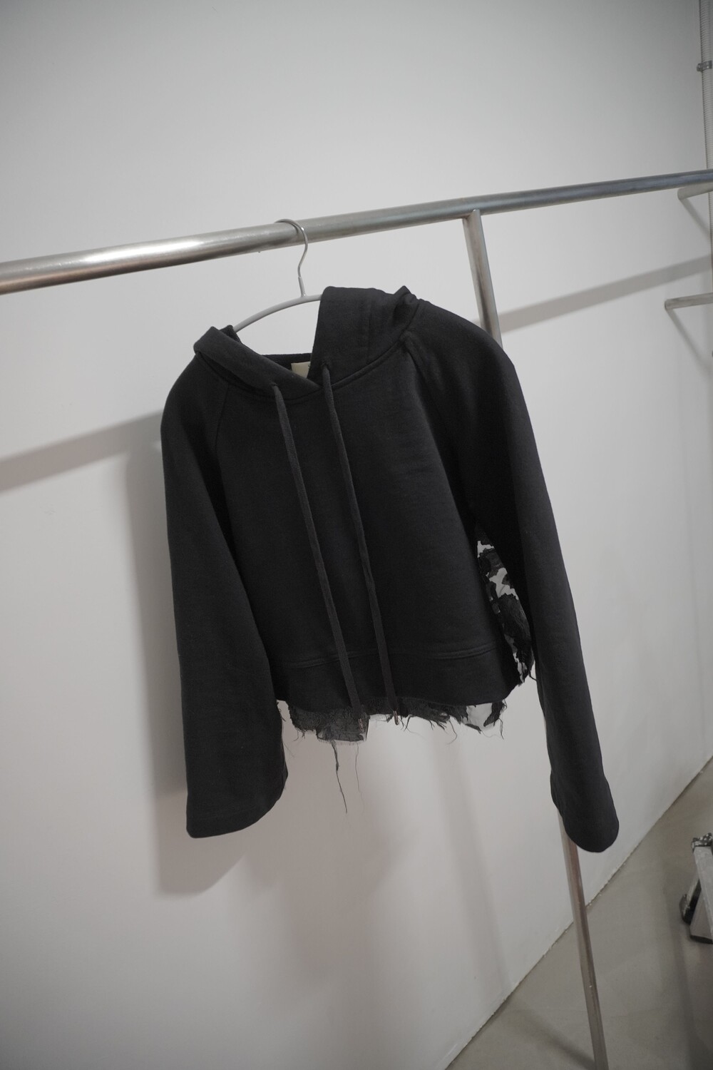 베이직한 스웻 후드 디자인에 플로럴 레이스 패널 디테일이 더해진 디자인으로, 밑단은 러프하게 컷팅된 마감이 특징입니다.