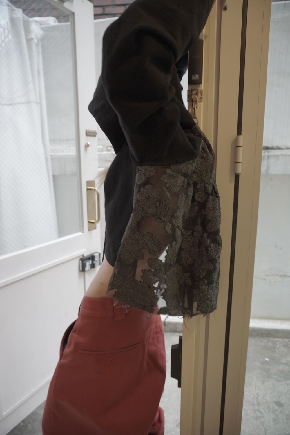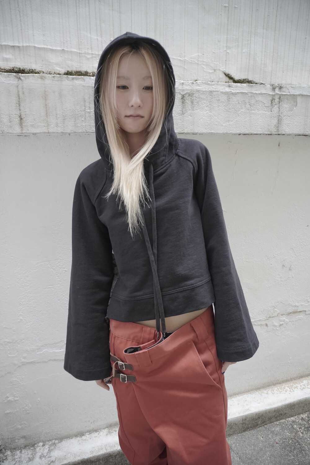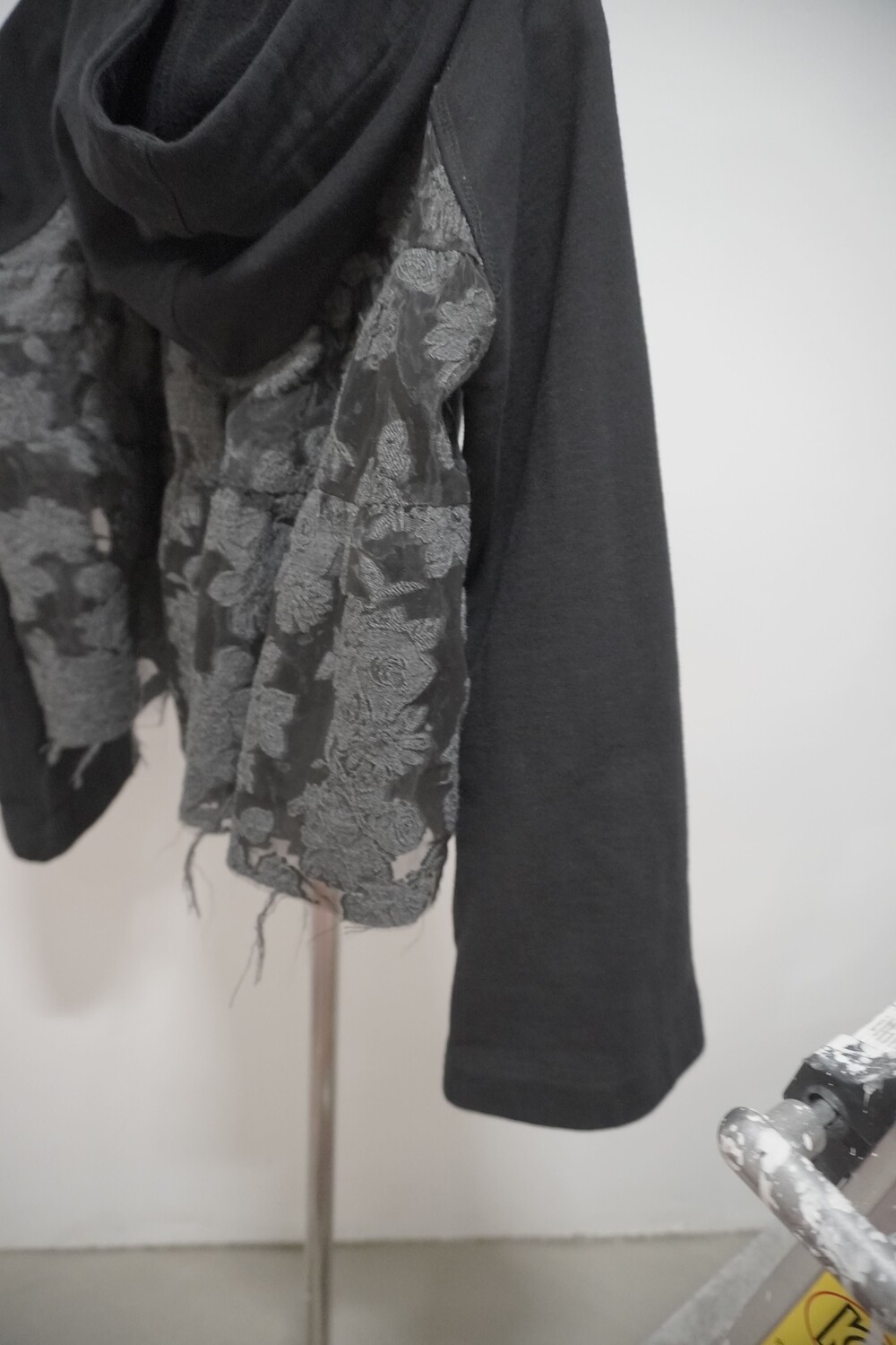 베이직한 스웻 후드 디자인에 플로럴 레이스 패널 디테일이 더해진 디자인으로, 밑단은 러프하게 컷팅된 마감이 특징입니다.
