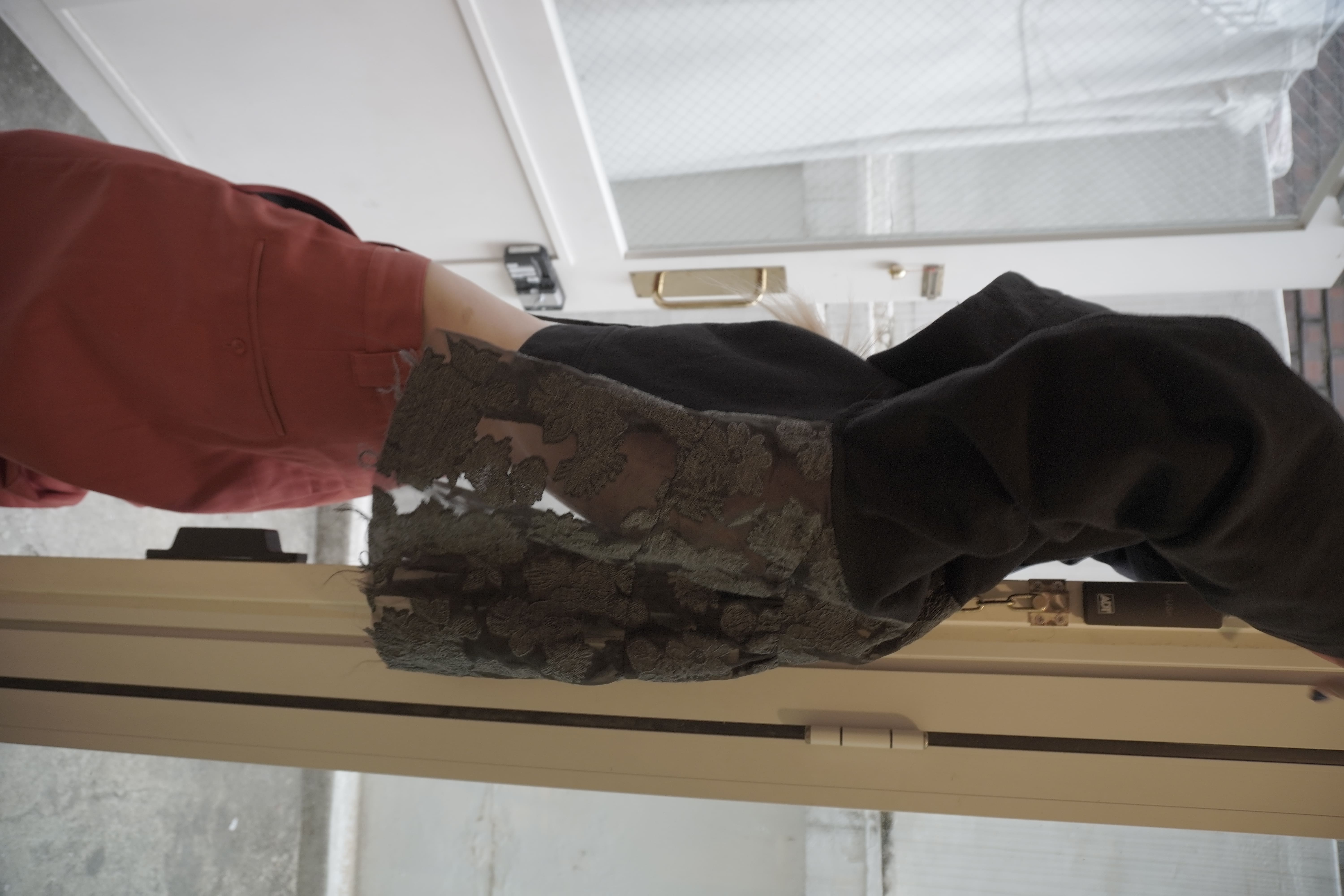 캐주얼한 스웻 소재와 여성적인 레이스 소재가 대비되는 디자인입니다.