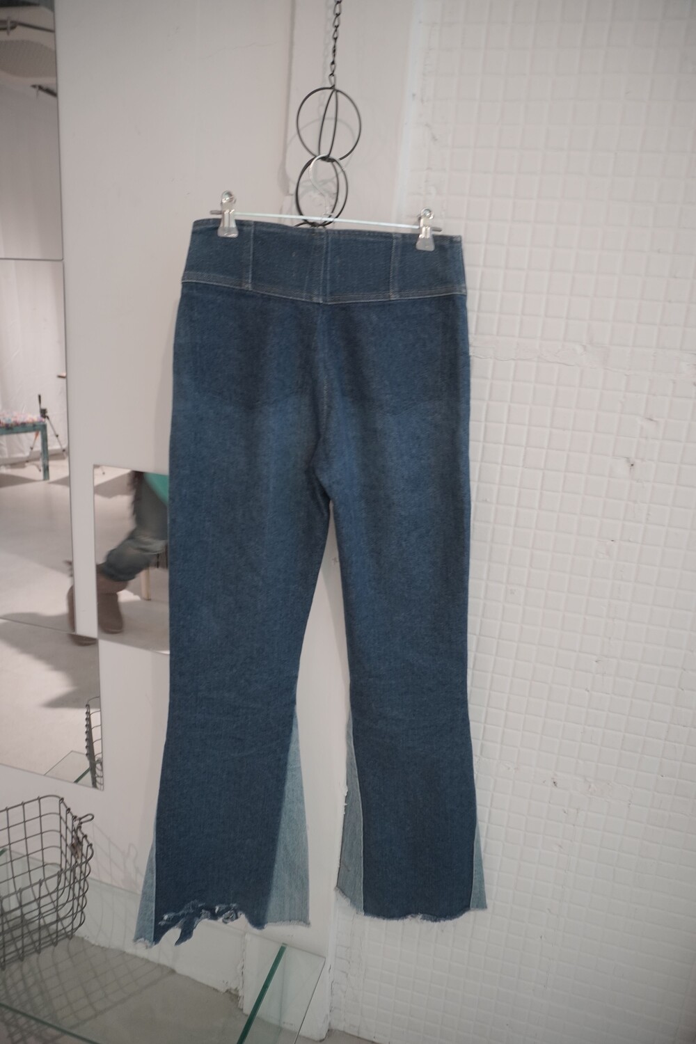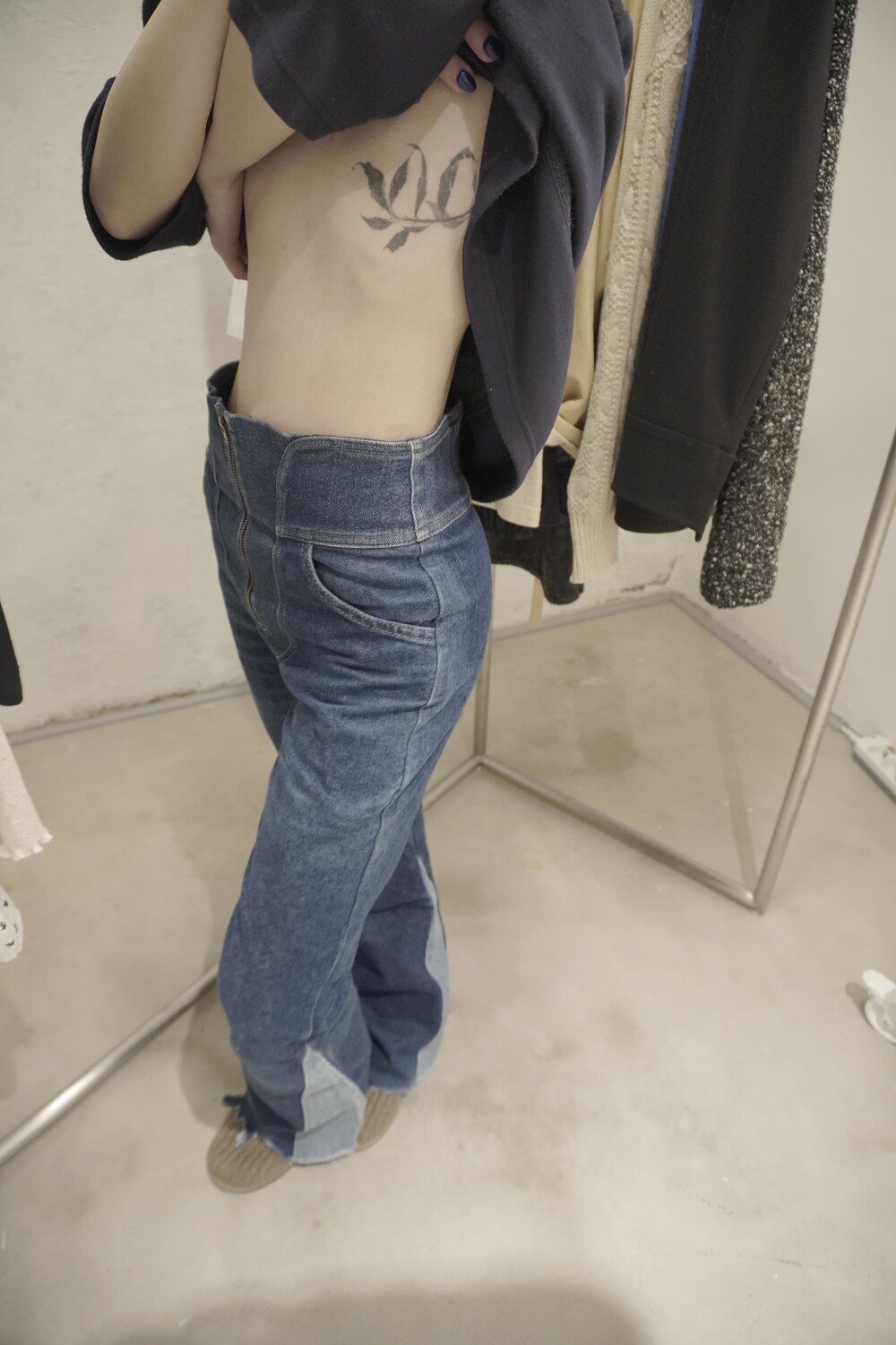 일본의 리메이크 전문 브랜드 77circa(77서카)의 아카이브 데님 팬츠입니다. 빈티지 데님을 해체하여 재조합하는 브랜드 특유의 공정을 거쳐 탄탄한 진청 바디와 측면 라인을 따라 흐르는 연청 데님 소재를 대담하게 배색(Panelled)한 디자인이 특징입니다. 세상에 단 하나뿐인 원오브원(One-of-a-kind) 피스로, 허리 라인을 높게 잡아주는 하이웨이스트 핏과 밑단으로 갈수록 자연스럽게 퍼지는 부츠컷 실루엣이 돋보이는 제품입니다.