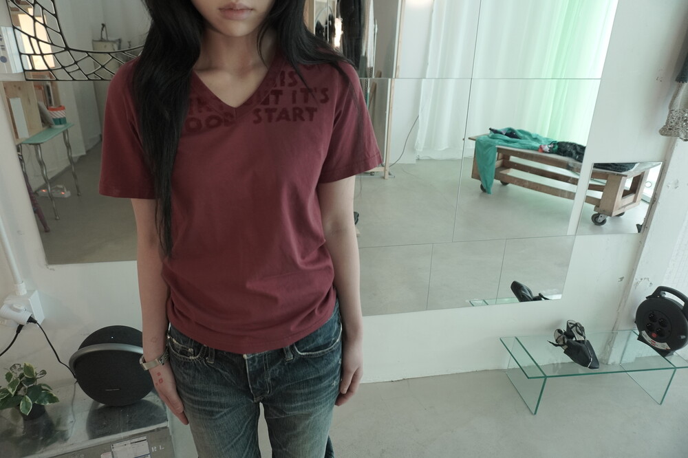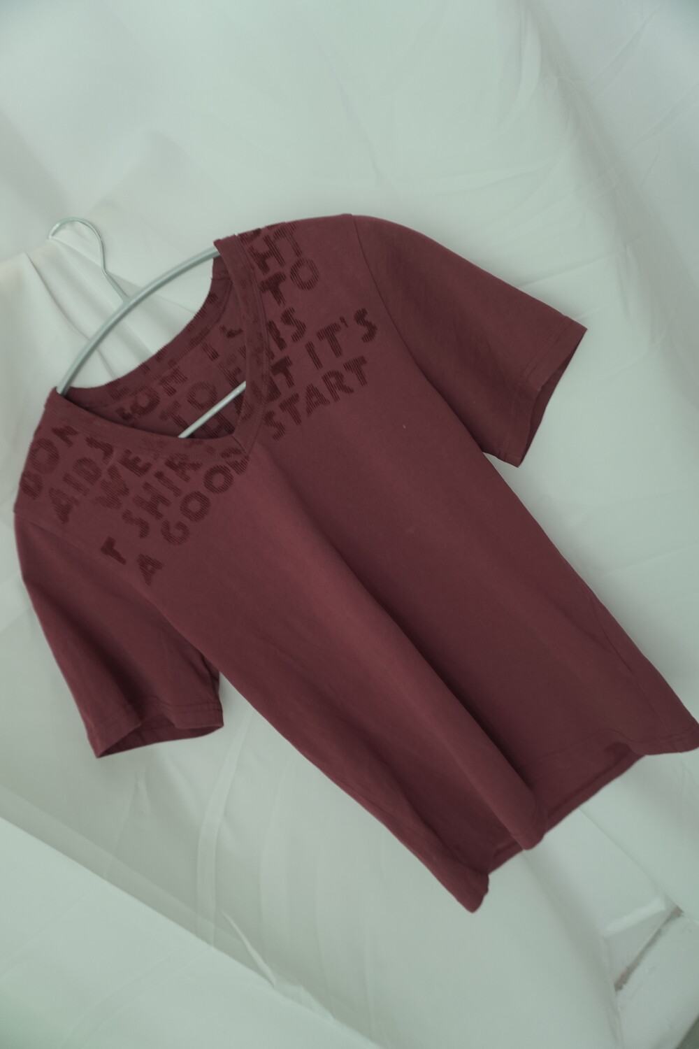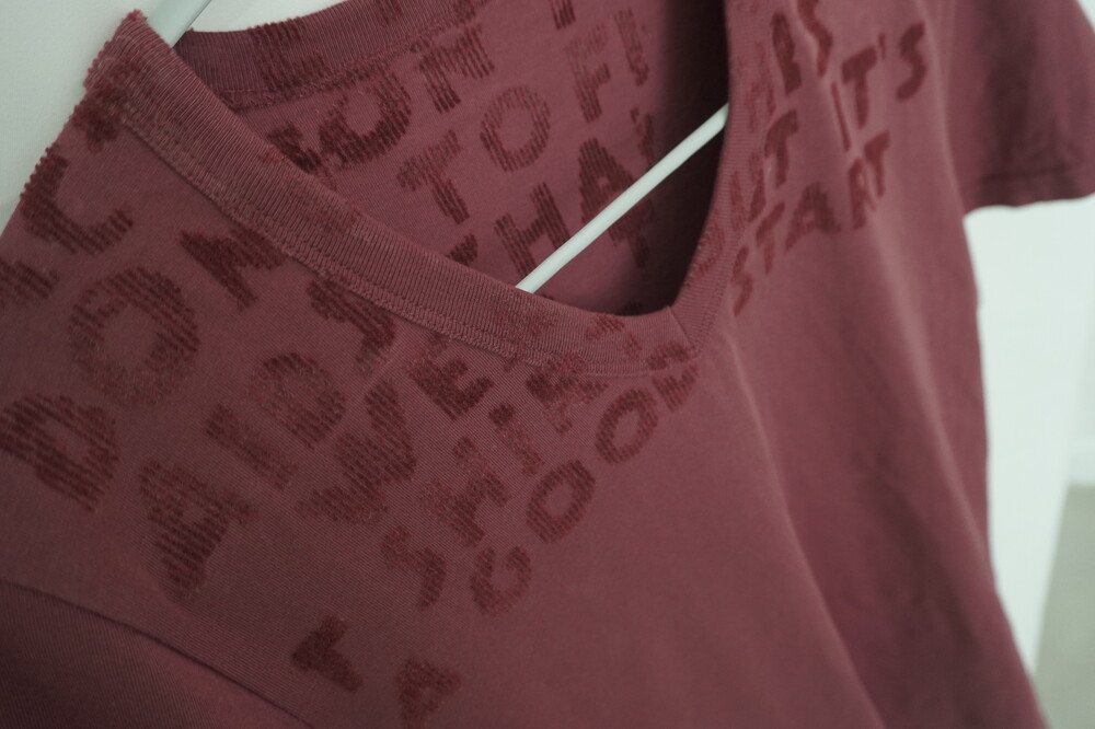 넥라인을 따라 배치된“There is more action to be done to fight AIDS than to wear this T-shirt but it’s a good start”메시지 타이포그래피가 특징으로, 브랜드의 철학과 사회적 메시지를 담은 아이코닉한 디자인입니다.