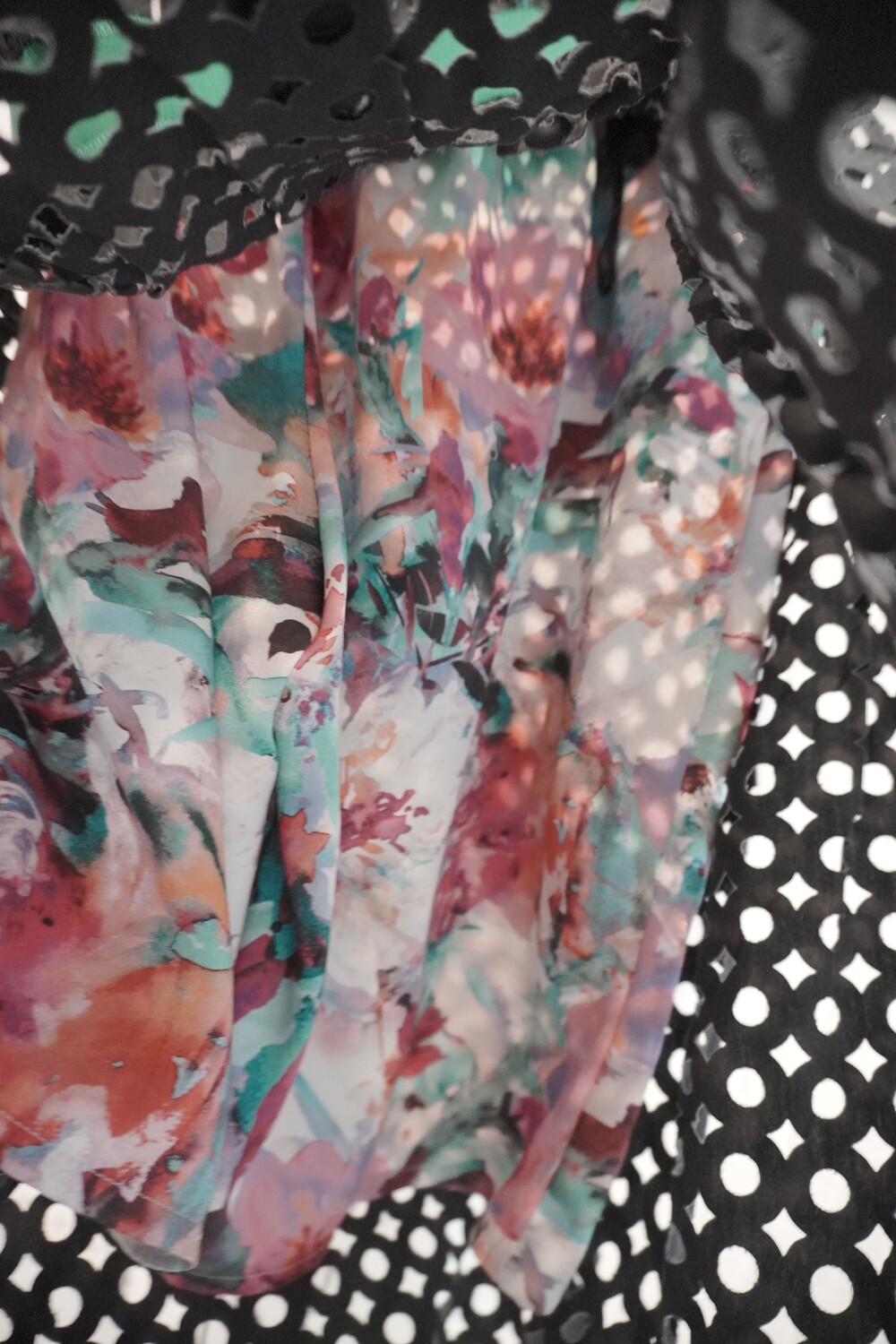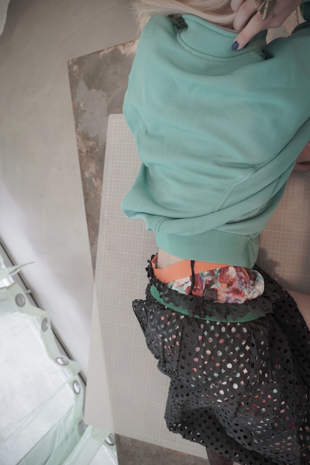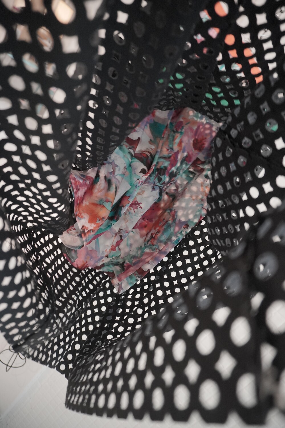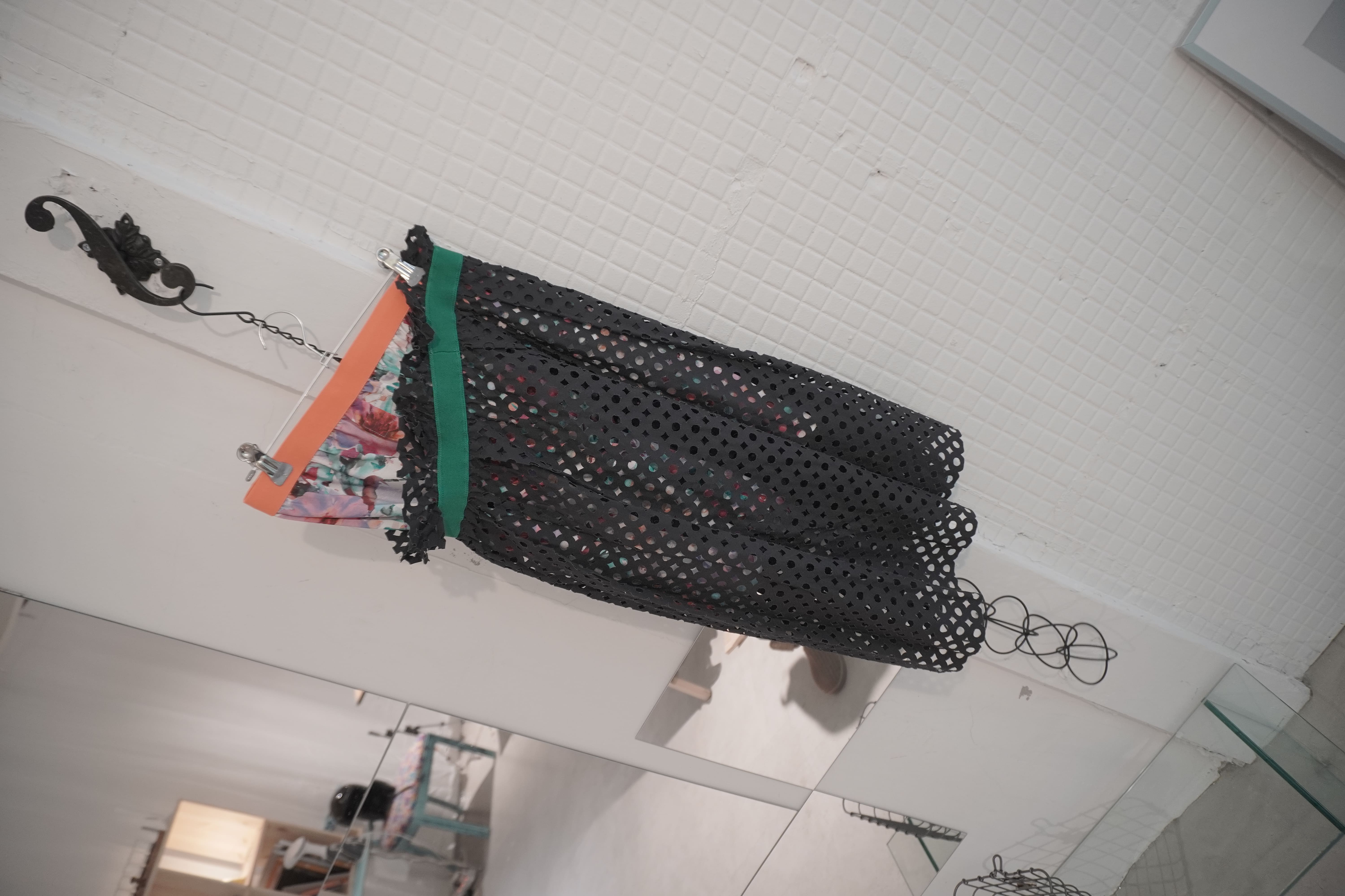 블랙 컬러의 정교한 퍼포레이티드(구멍 뚫린) 니트 레이어 치마와 다채로운 그래픽 워싱이 들어간 하이브리드 미니 하의가 한 세트로 구성되어 있습니다. 각 피스는 스냅 버튼이나 벨트로 고정할 수도 있으며, 완전히 분리하여 각각 단독으로 착용할 수도 있어 여러 스타일링이 가능합니다.