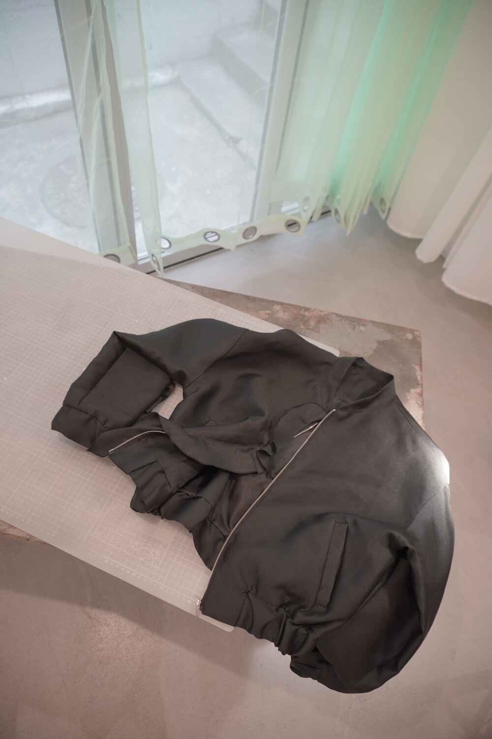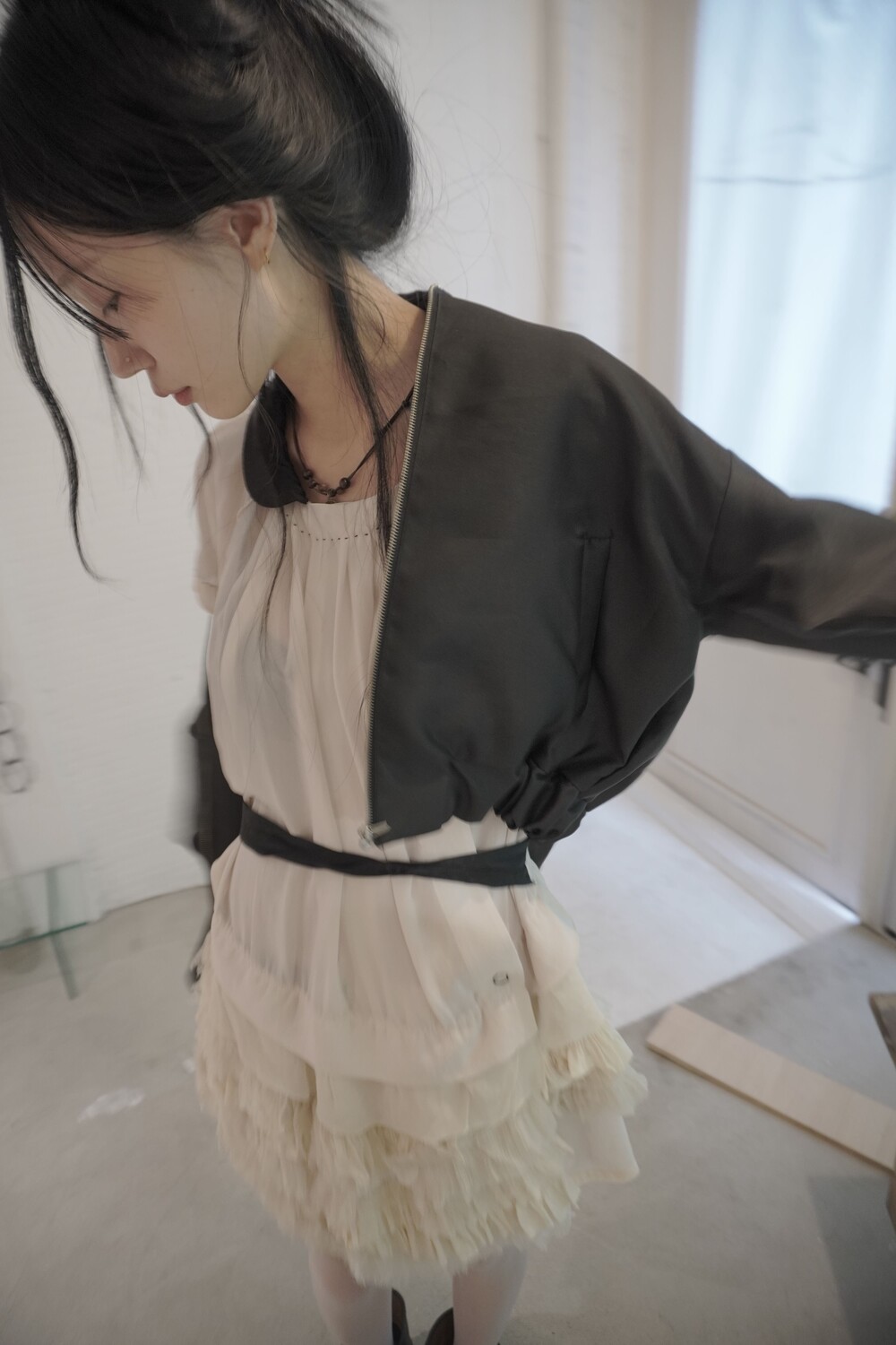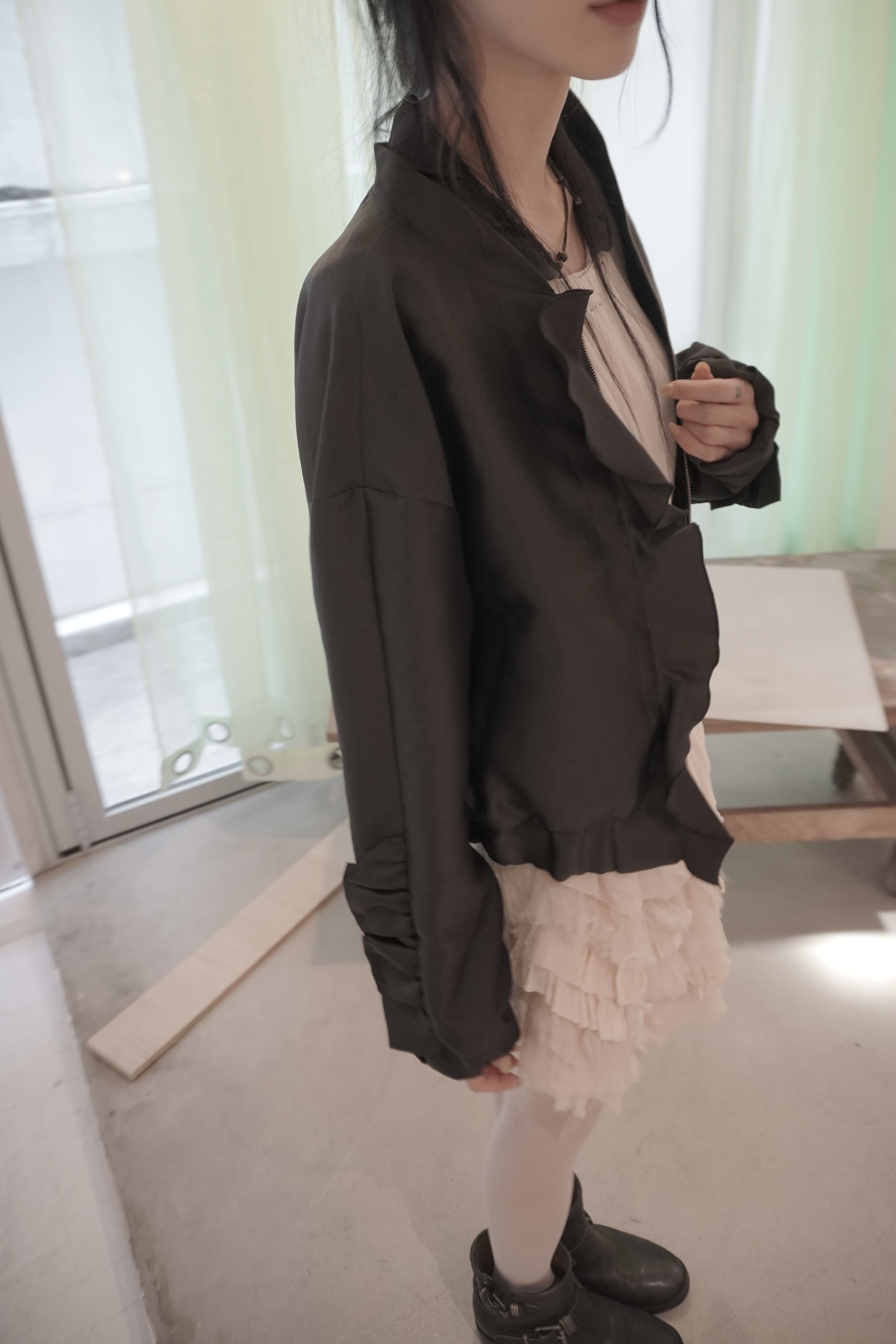 - 전면 지퍼 라인을 따라 배치된 입체적인 프릴 장식